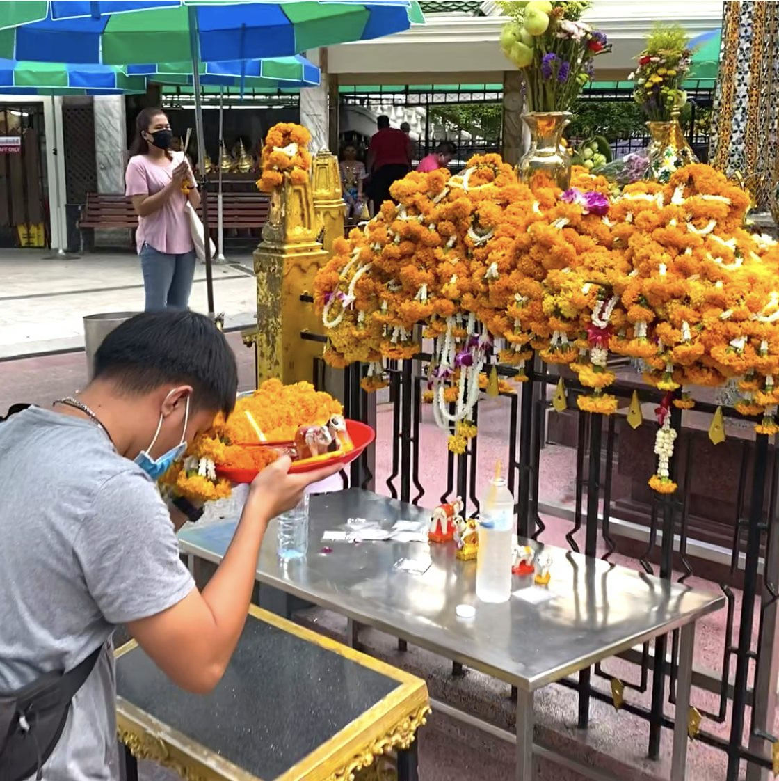 - We go to the Erawan Shrine and offer flower garlands in your name.