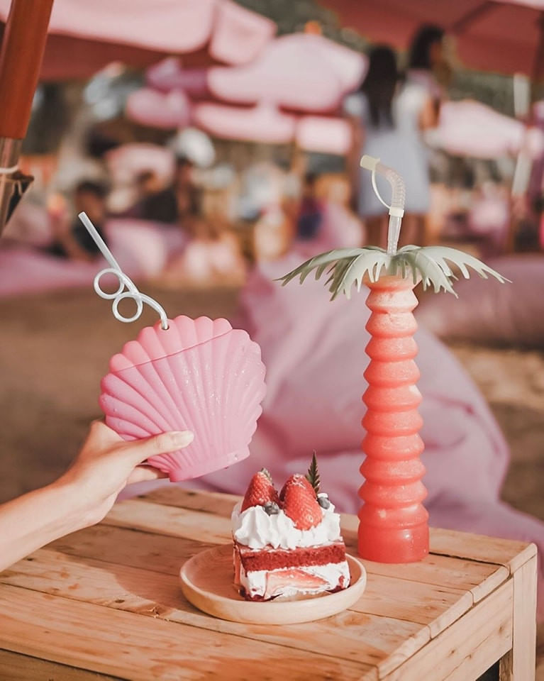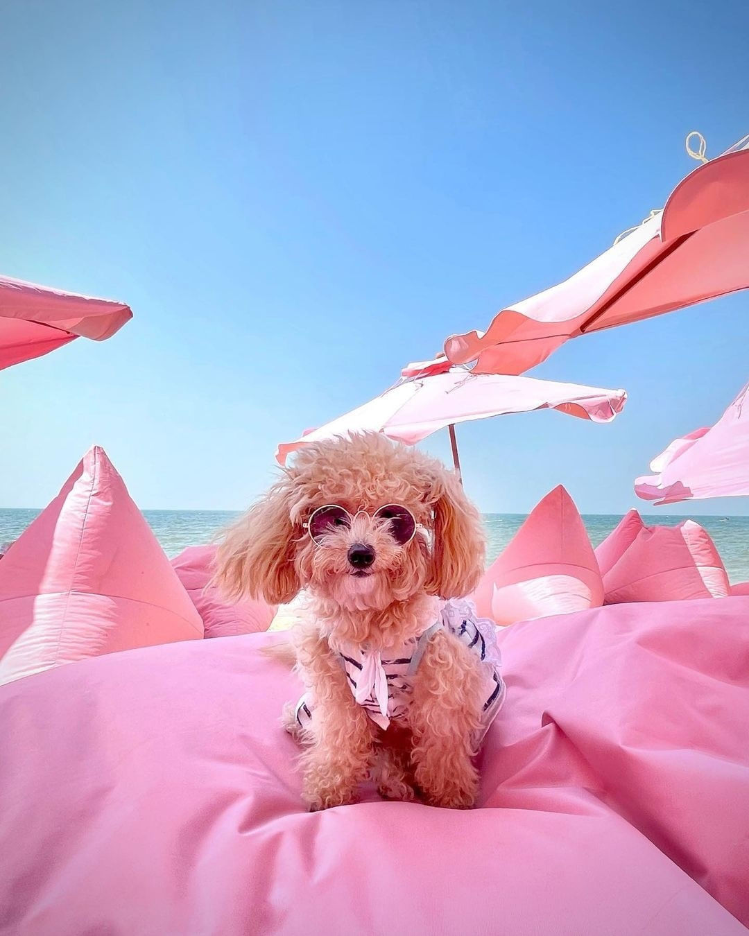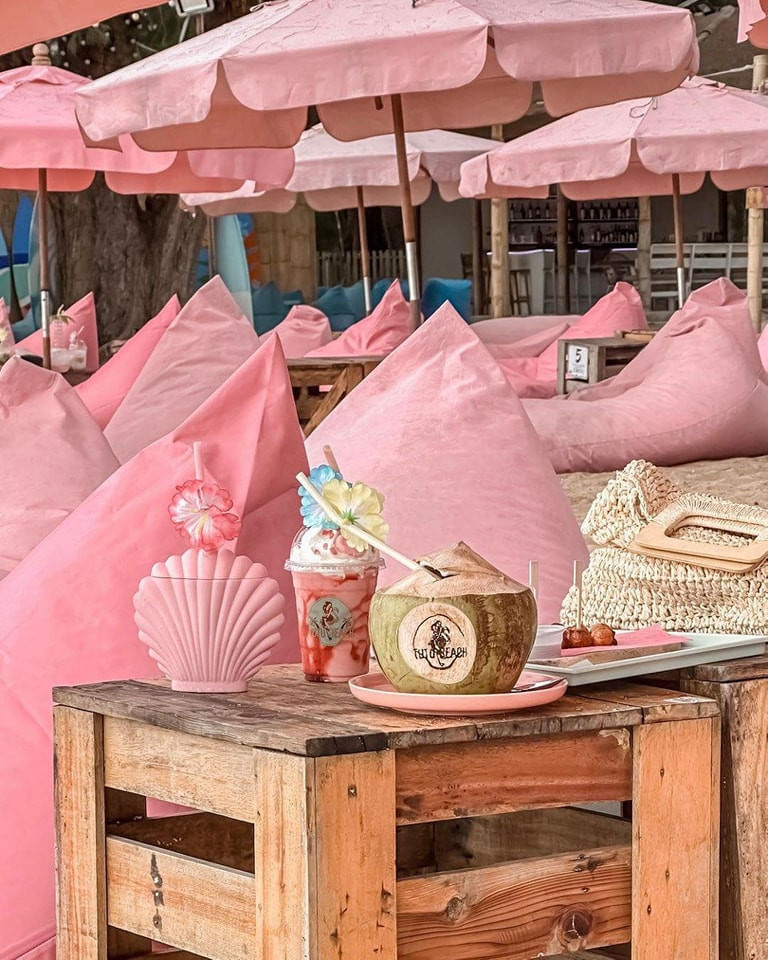 Relax on pink beanbags under umbrellas, with endless ocean views—a perfect backdrop for dreamy, girly photos.