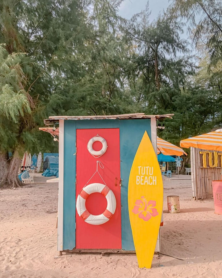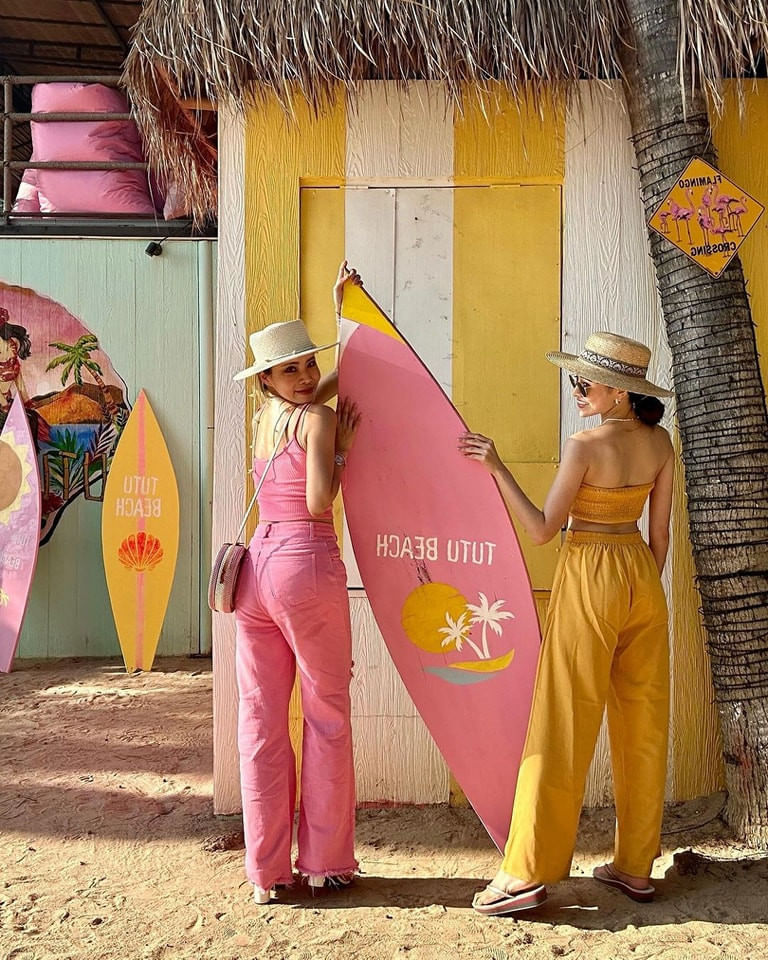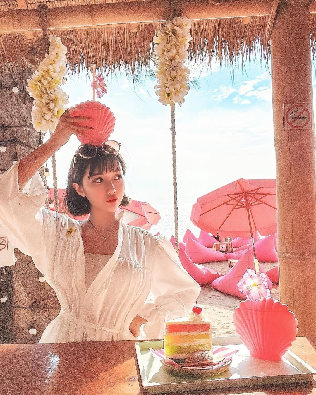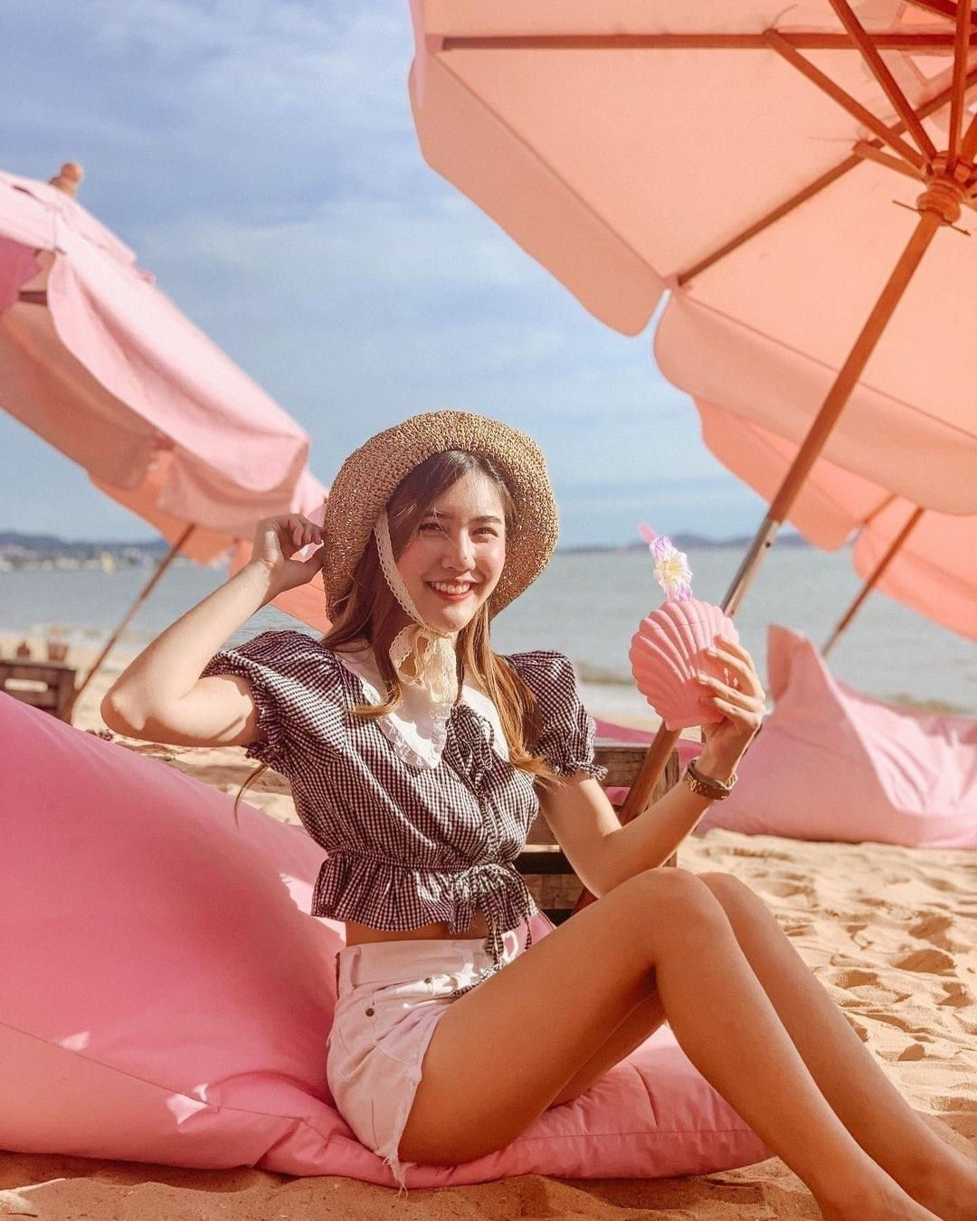 Relax on pink beanbags under umbrellas, with endless ocean views—a perfect backdrop for dreamy, girly photos.
