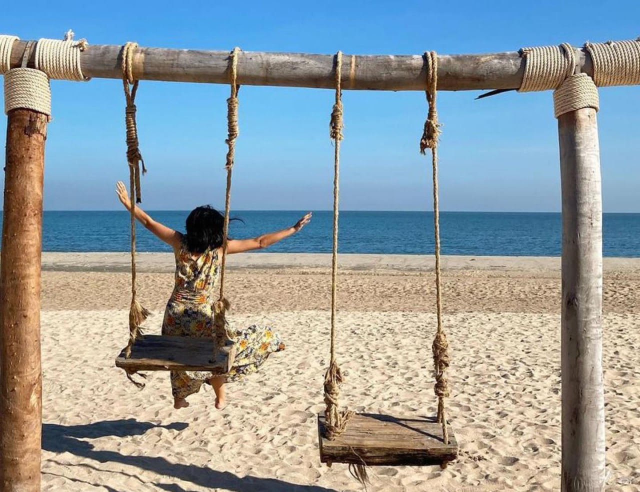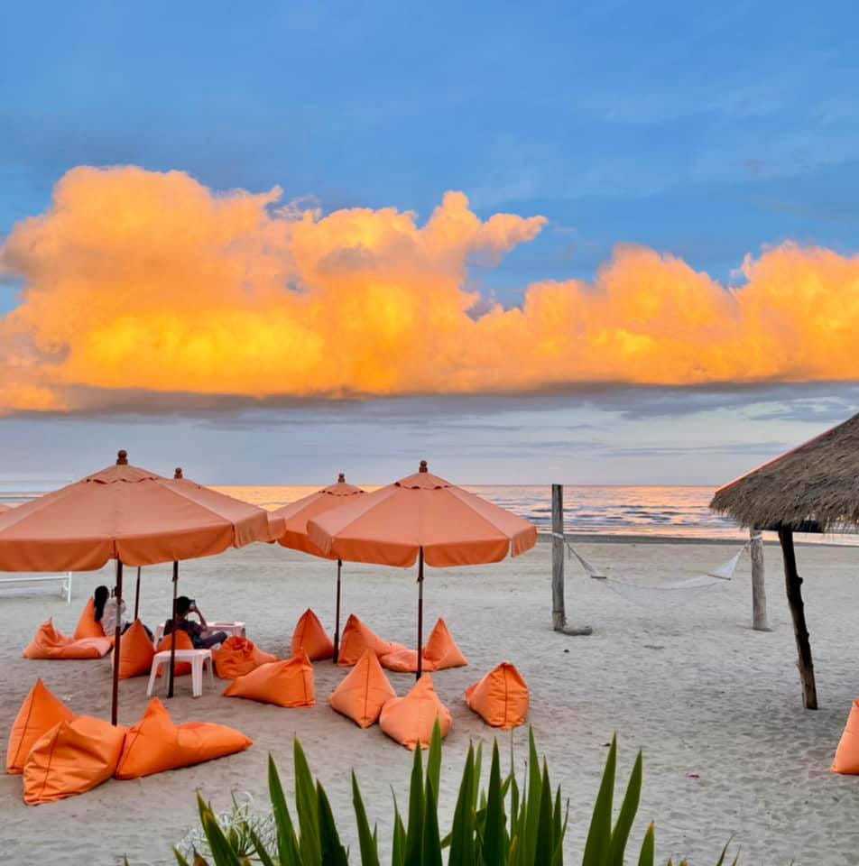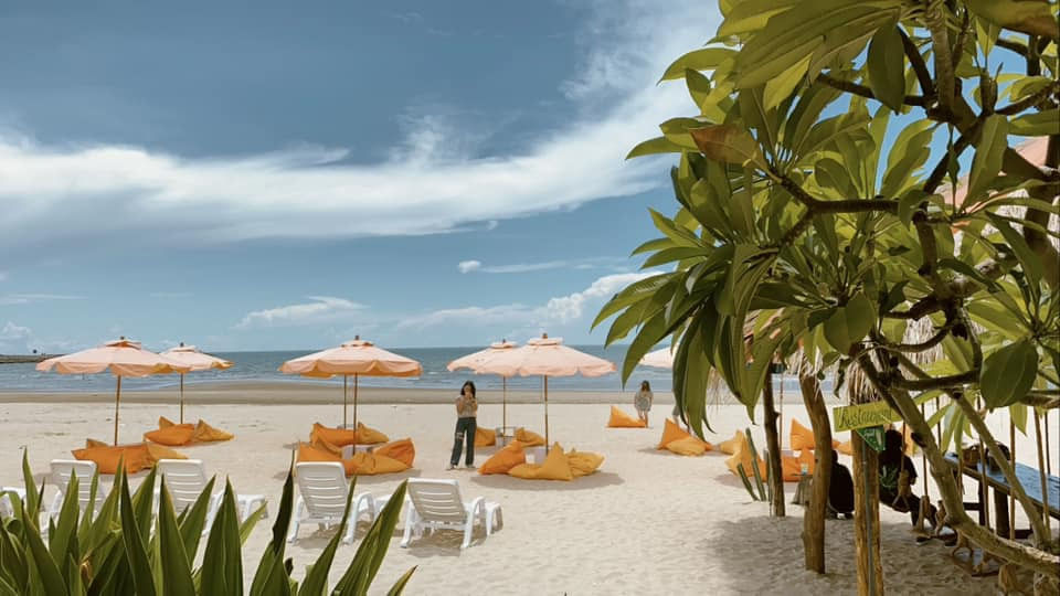 Cha-Am Beach is known for its wide sandy coastline and calm, clean blue waters—much quieter than Hua Hin Beach. On this relaxing beach sits a stylish orange-themed café, with bright beanbags and umbrellas scattered across the sand. Swing seats and net hammocks add to the chill vacation vibe—grab a drink, unwind, and soak in the seaside mood.