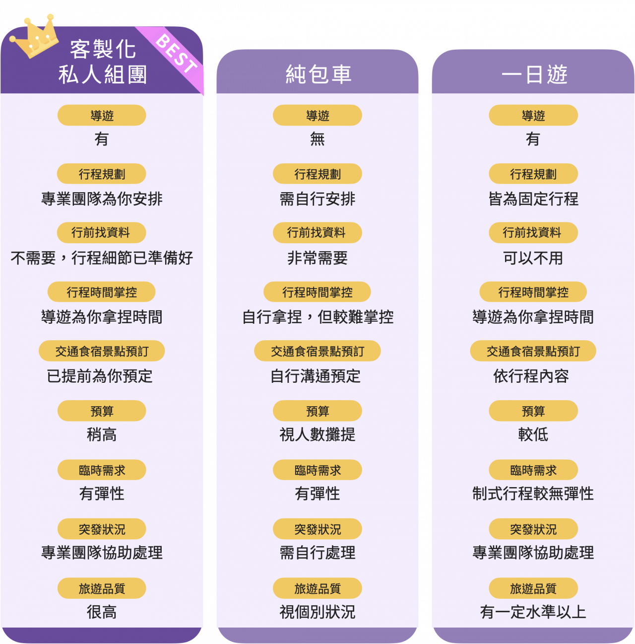 ⑩「客製化私人組團」與「包車」或「一日/二日遊」有何不同? 哪個適合我呢?