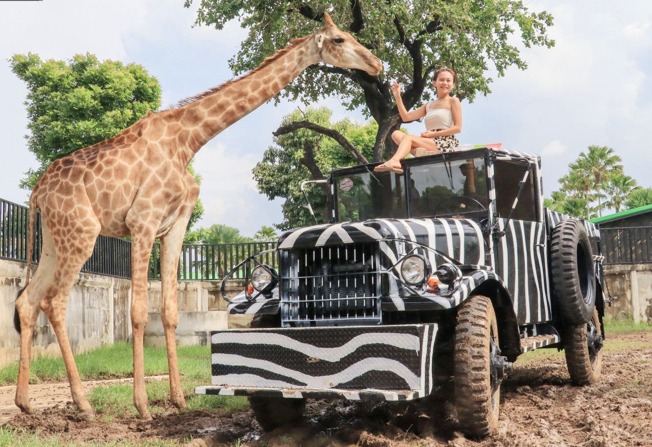 大城獅子園(含入門票)|與長頸鹿在吉普車前親密互動拍照(加價購項目,須提早預約)︱大城推薦泰式傳統小吃包含︱馬哈泰寺朝聖樹中佛︱河畔網美咖啡廳賞夕陽(每人含飲料一杯)︱大城夜市品嚐當地泰式小吃晚餐自理|回飯店